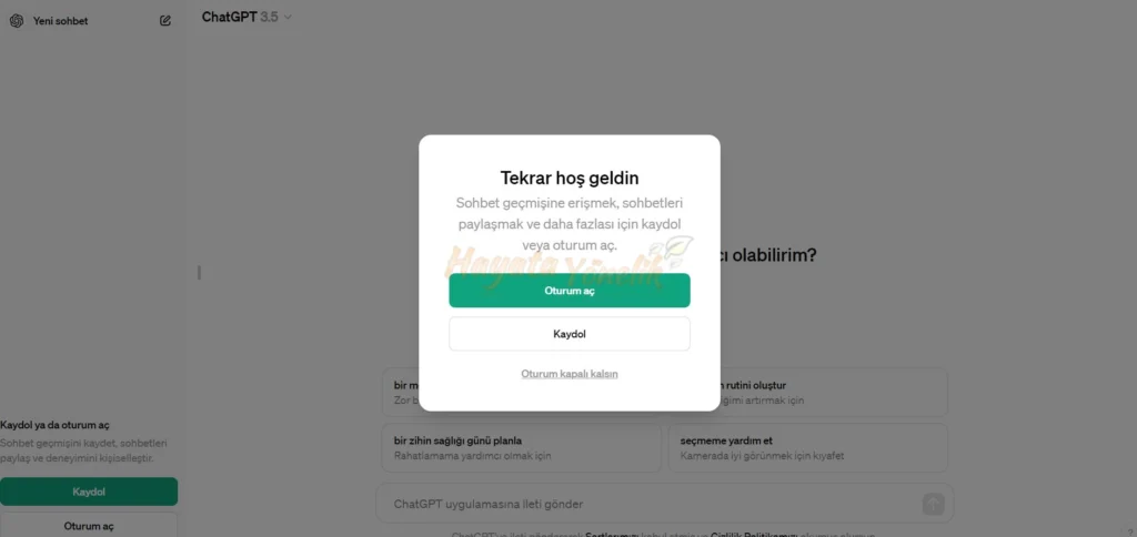 Siteye girdiğimizde hoş geldin ekranı çıkıyor. Dilerseniz kayıt olmayıp chat gpt 3,5 modelini kullanabilirsiniz. Fakat biz Chatgpt 4o modelini kullanmak için kayıt olmamız gerekiyor.