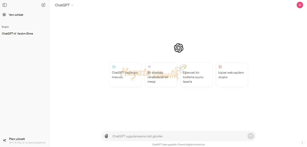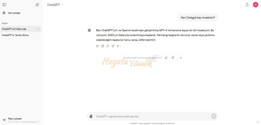 görüldüğü gibi Chatgpt de 4 modeli olduğunu söylüyor. Fakat şöyle bir nokta var ücretsiz kullanımda sınırlıdır. Eğer sınırsız bir şekilde kullanmak istiyorsanız. Sol altta yer alan planı yükselt seçeneğine tıklayarak sınırsız erişime sahip olabilirsiniz.