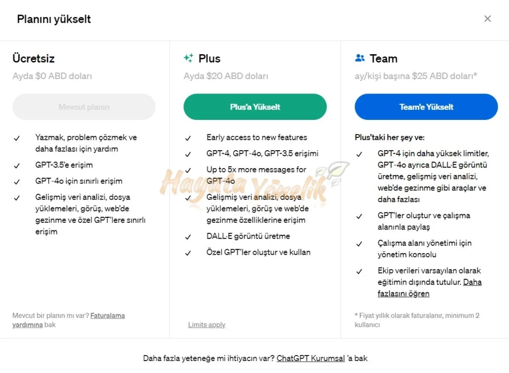 Chatgpt fiyatlandırmaları yukarıdaki gibidir.